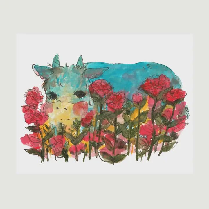 Color print on matte photo paper. Each print is packed in a plastic sleeve with a piece of 22pt chipboard for support. I hand sign each print on the back with my signature and year first released. I place a small sticker on the back with my website address and print size. Prints are borderless/cut down to the edge of the illustration. Printed, cut, and packaged at my home studio. The original drawing was made with watercolor and marker on white paper. Featuring a little blue cow resting in the flowers.